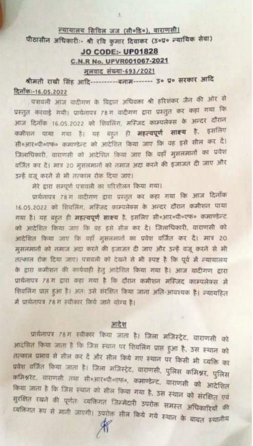 ज्ञानवापी मस्जिद में सर्वे की जगह शिवलिंग मिलने के बाद कोर्ट ने कहा उस जगह को फौरन सील कर सुरक्षा में लिया जाए और वहां किसी भी व्यक्ति के आने जाने पर रोक लगाई जाये। देखिए अदालत का आदेश –