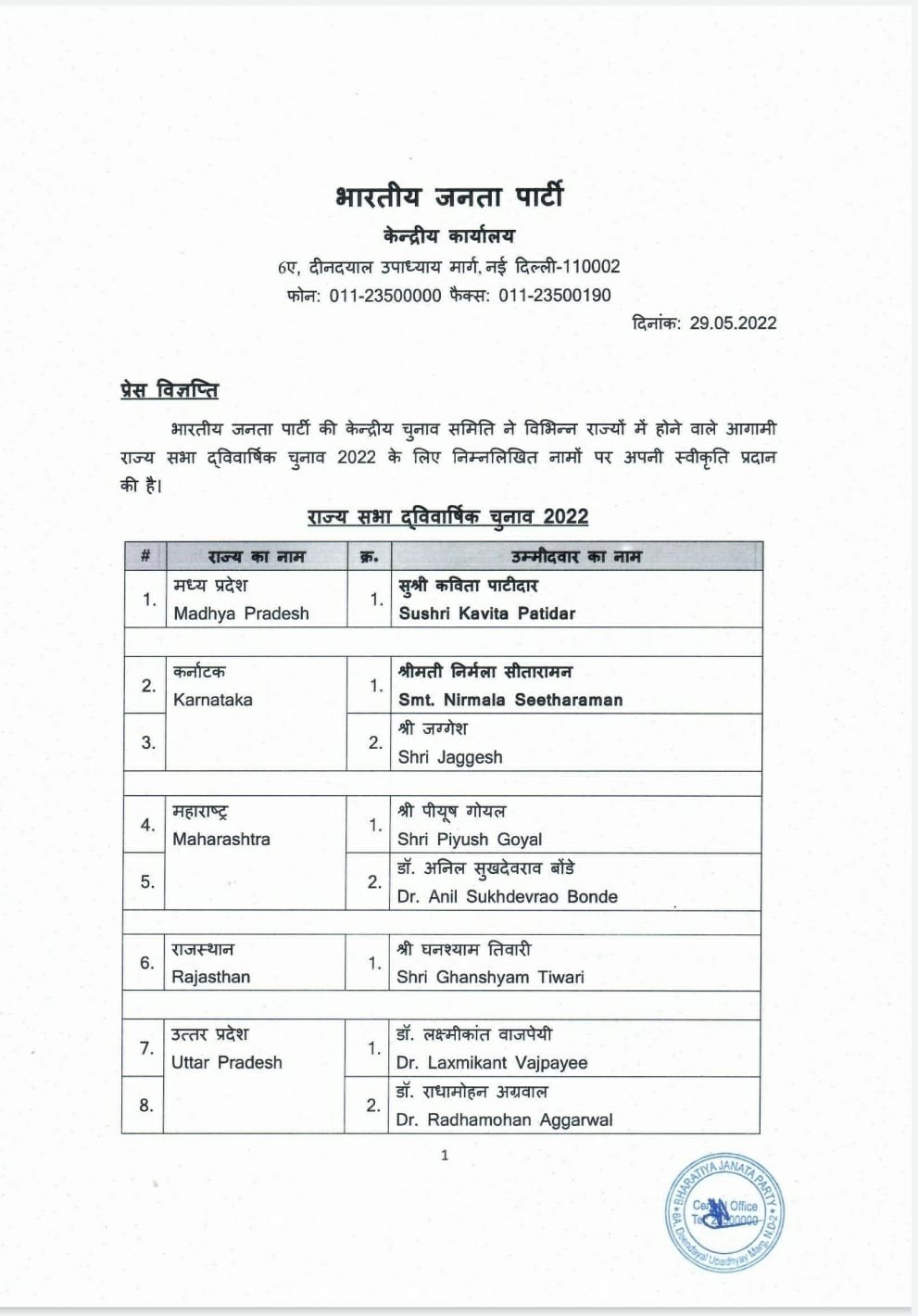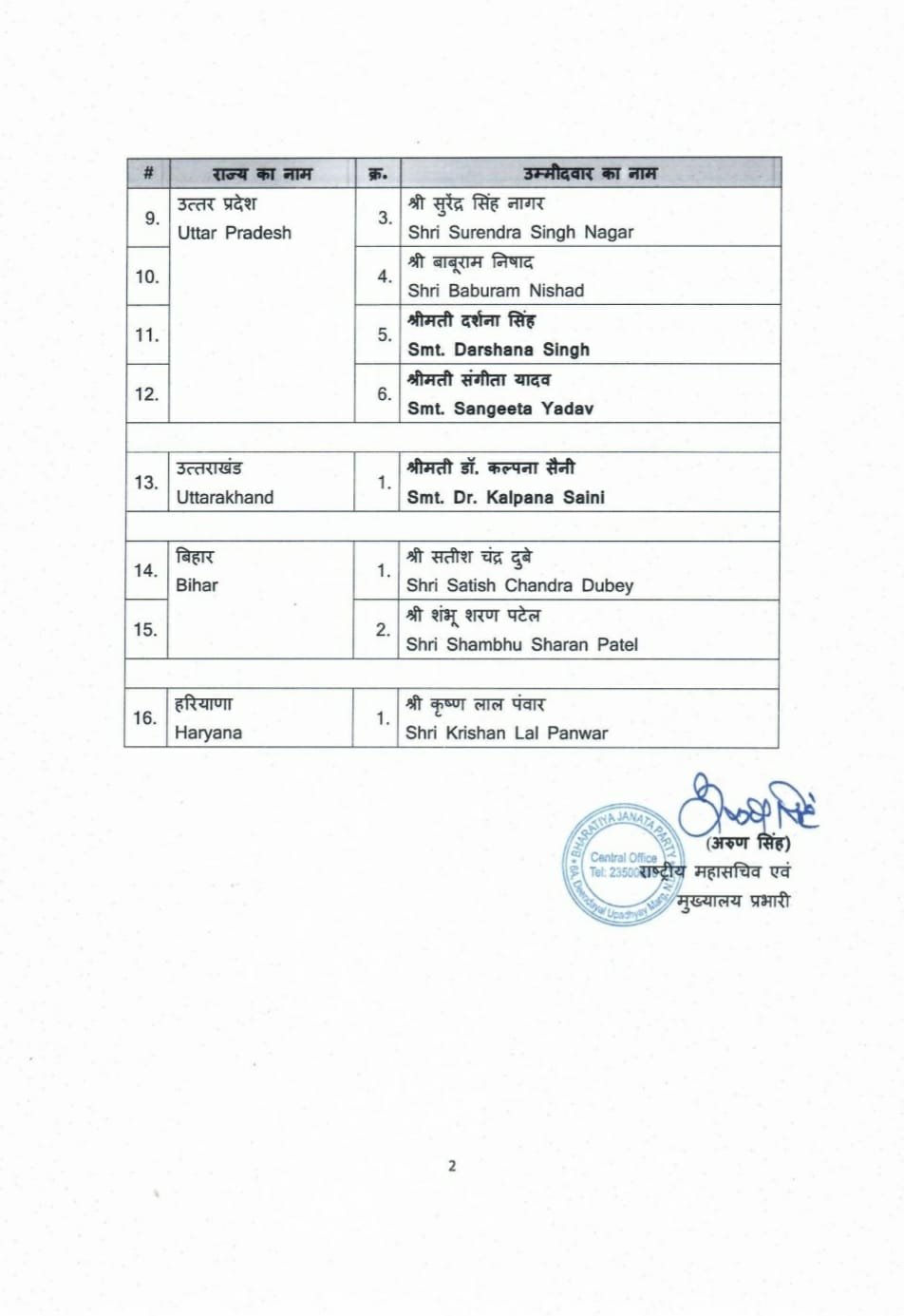 भाजपा ने उत्तराखंड से डा. कल्पना सैनी को राज्यसभा उम्मीदवार बनाया है। आज भारतीय जनता पार्टी ने विभिन्न राज्यों में रिक्त राज्यसभा सीट के लिए उम्मीदवारों की सूची जारी की है।