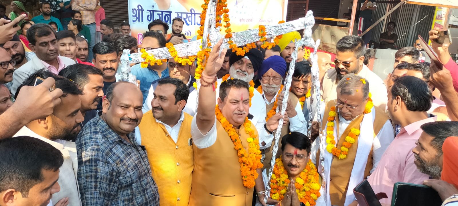 सैकड़ों मोटरसाइकिलों और दर्जनों कारों के काफिले के साथ ढोल नगाड़ों की आवाज पर नाचते गाते भाजपा कार्यकर्ताओं का जोश देखते ही बनता था। स्वागत का काफिला जब यहां से चला तो ढेला नदी के पास संजीवनी हॉस्पिटल पर भाजपा नेता दीपक बाली के मार्गदर्शन में मुकेश चावला, मनीष चावला, राजकुमार गुंबर, मनोज बाटला अमन बाली जसपुर के ज्येष्ढ ब्लॉक प्रमुख गुरताज सिंह भुल्लर पार्षद अनिल चौहान राजकुमार सेठी मंडी समिति के अध्यक्ष रुपेंद्र सिंह बग्गा अमित सक्सेना पवित्र शर्मा एवं उनके दर्जनों साथियों ने काफिले का जोरदार स्वागत कर जिलाध्यक्ष गुंजन सुखीजा को फूल मालाओं से लाद दिया और उनका तिलक कर झूमते नाचते भाजपाइयों ने अपने जिलाध्यक्ष को यहां लड्डूओं से तोला ।