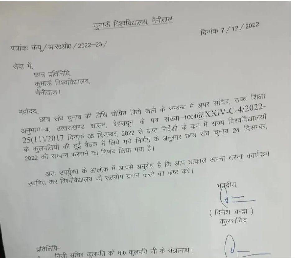 जानकारी के अनुसार कुमाऊं विश्वविद्यालय में छात्र संघ चुनाव 24 दिसंबर को संपन्न कराने का निर्णय लिया गया है। जारी आदेश में लिखा है कि संघ चुनाव की तिथि घोषित किये जाने के सम्बन्ध में अपर सचिव , उच्च शिक्षा अनुभाग -4 . उत्तराखण्ड शासन , देहरादून के पत्र संख्या -1004 @ XXIV – C – 4 / 2022 25 ( 11 ) / 2017 दिनांक 05 दिसम्बर , 2022 से प्राप्त निर्देशों के क्रम में राज्य विश्वविद्यालयों कुलपतियों की हुई बैठक में लिये गये निर्णय के अनुसार छात्र संघ चुनाव 24 दिसम्बर को सम्पन्न करवाने का निर्णय लिया गया है।