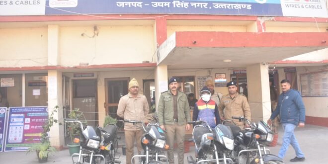 काशीपुर। यहाँ पुलिस ने एक व्यक्ति को चोरी की चार बाइकों समेत गिरफ्तार करने में सफलता प्राप्त की है।