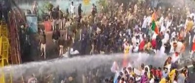 प्रदर्शनकारियों पर पुलिस ने वाटर कैनन से पानी की बौछार करते हुए उन्हें रोकने का प्रयास किया।