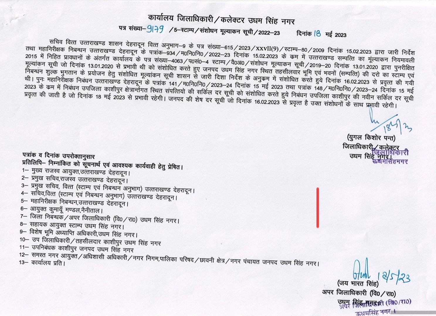 ऊधमसिंहनगर के जिलाधिकारी युगल किशोर पंत ने बदले हुए सर्किल रेट के संबंध में आदेश जारी कर दिया है जो कि 18 मई से प्रभावी हो गये हैं।