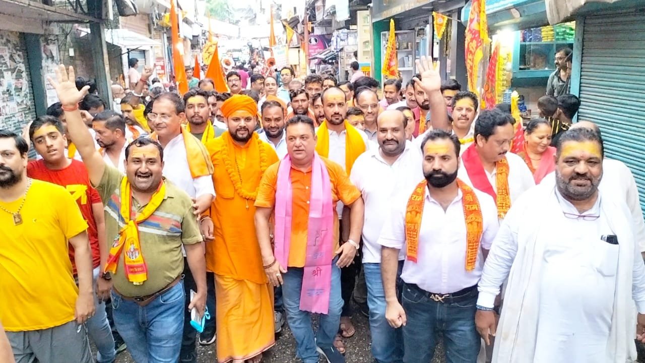 काशीपुर। राम मंदिर निर्माण के तीसरे वार्षिकोत्सव पर यहां किला बाजार से एक विशाल एवं भव्य ध्वज यात्रा निकाली गई। जोश खरोश से लवरेज राम भक्तों के जय श्री राम के गगनभेदी नारों से पूरा माहौल ऐसा हो गया जैसे यह काशीपुर नहीं बल्कि अयोध्या हो।