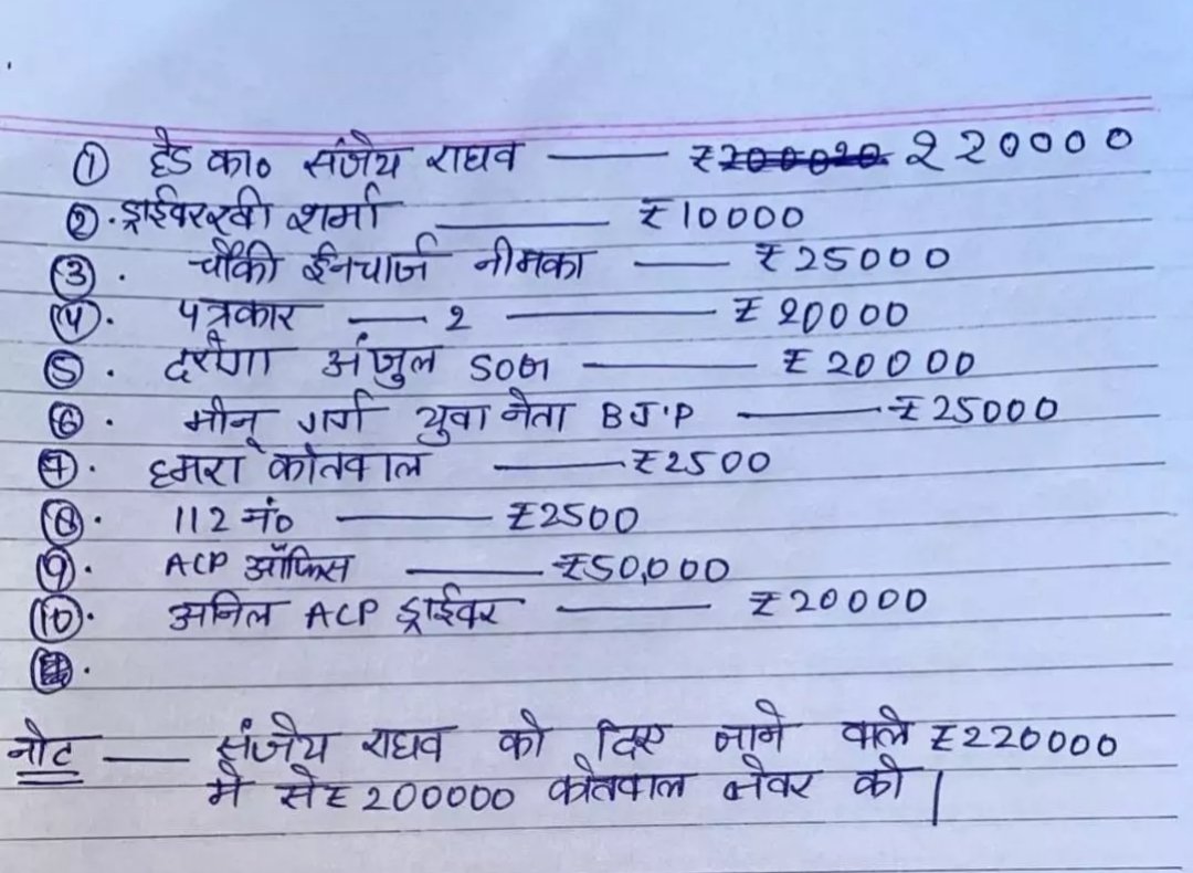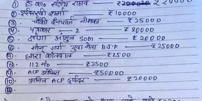 नौएडा। थाने में तैनात पुलिस अधिकारी व कर्मचारियों को कितनी रिश्वत दी जाती है? अगर आप नहीं जानते तो जान लीजिए रिश्वत की रकम और किसे कितना दिया जाता है?इसकी रेट लिस्ट जारी हो गई है। हालांकि ये रेट लिस्ट जारी होने के बाद चौकी प्रभारी को हटा दिया गया है।