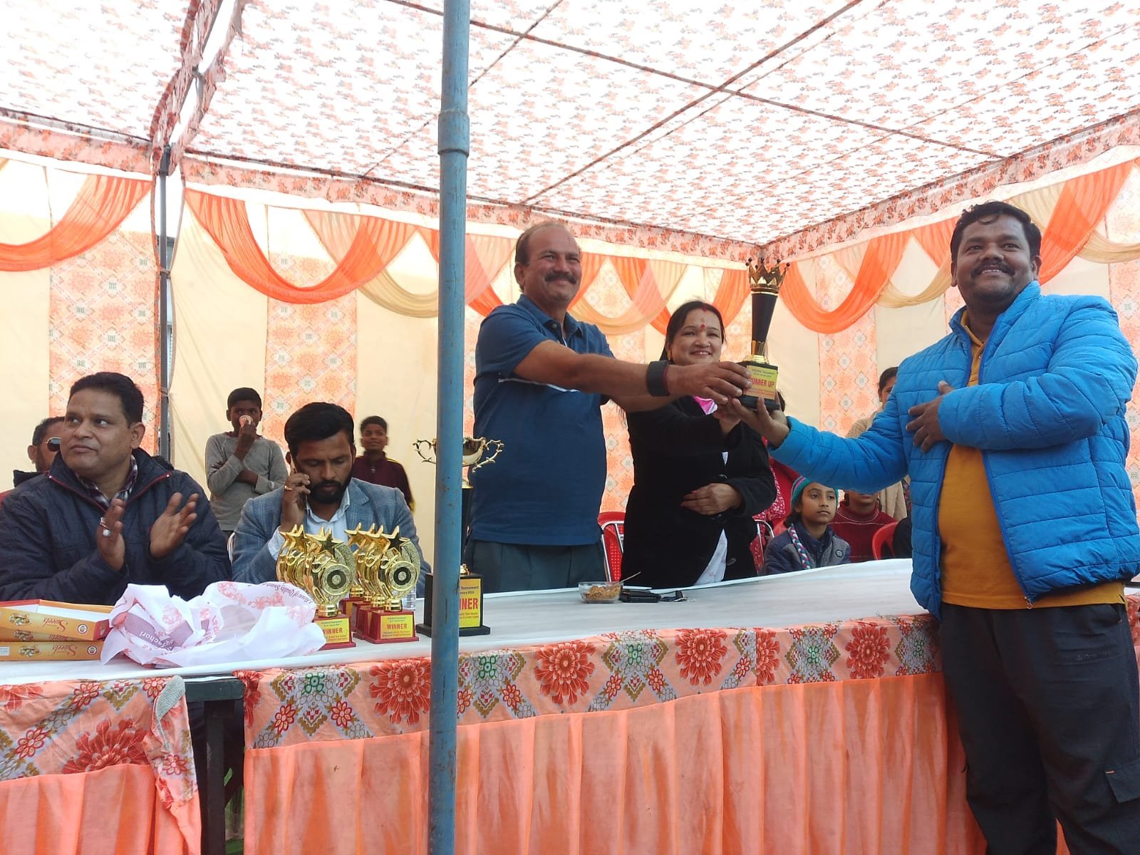 विजेता व उपयोगिता टीम के खिलाड़ियों को मुख्य अतिथि जिला पंचायत सदस्य कमलेश चंदोला व ग्राम प्रधान सीमा पाठक एवं बिपिन चंद्र जोशी के साथ संयुक्त रूप से विजेता टीम को 4100 व ट्रॉफी एवं उपविजेता टीम को 2100 व ट्राफी प्रदान करते हुए सभी खिलाड़ियों का हौसला अफजाई की।