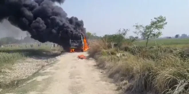 उत्तर प्रदेश के गाजीपुर जिले में दर्दनाक हादसा हुआ है. मरदह थाना क्षेत्र में महाहर धाम के पास यात्रियों से भरी एक प्राइवेट बस में हाईटेंशन तार गिरने से भीषण आग लग गई. आग से कई यात्रियों की जलकर मौत की आशंका जताई जा रही है. हालांकि कितने यात्रियों की मौतें हुई हैं, इसको लेकर अभी तक आधिकारिक पुष्टि नहीं हुई है. ये बस शादी समारोह में जा रही थी, तभी रास्ते में बस पर हाईटेंशन तार गिर गया और बस आग की चपेट में आ गई.