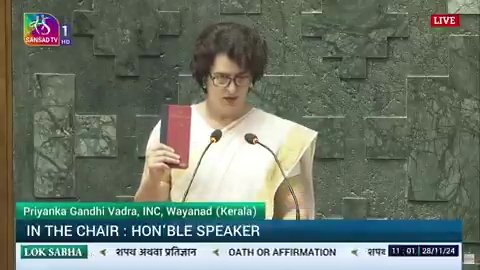 शपथ के दौरान वह हाथ में संविधान की कॉपी लिए रहीं। इस तरह उन्होंने संविधान वाले दांव को भी शपथ के साथ ही चलने की कोशिश की, जिस पर कांग्रेस समेत विपक्ष ने लोकसभा चुनाव के दौरान नैरेटिव तैयार किया था।