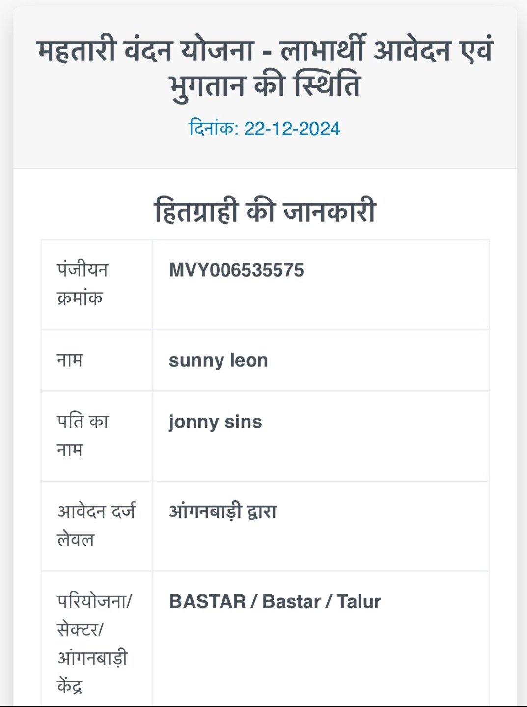 जानकारी के मुताबिक सनी लियोनी के नाम के लाभार्थी के खाते में पिछले 10 महीने से हर माह 1000 रुपये दिए गए हैं। ये मामला राज्य के बस्तर इलाके का है। महतारी वंदन योजना का लाभ बस्तर में बॉलीवुड की चर्चित अभिनेत्री सनी लियोन को मिल रहा है। सरकार की महतारी वंदन योजना की वेबसाइट पर इसी नाम से लाभार्थी रजिस्टर्ड है। वेब साइट में पंजीयन क्रमांक MVY006535575 डालने पर हितग्राही का नाम सनी लियोन और पति का जॉनी सिंस आ रहा है। हितग्राही को बाकायदा योजना के शुरुआत होने से अब तक हर महीने खाते में एक हजार रुपए की राशि डाली जा रही है।