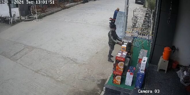 आज दोपहर गिरीताल रोड पर दयाल किचन मार्ट के बाहर बाइक पर सवार दो लोग आये और बाइक रोकी। पीछे बैठा व्यक्ति बाइक से उतरा। इस दौरान वह इधर उधर आते जाते लोगों को देखता रहा। इसी बीच वह शो रूम के पास पहुंचा जबकि उसका दूसरा साथी बाइक स्टार्ट कर बैठा रहा। एकाएक बाइक से उतरा व्यक्ति शो रूम के बाहर रखे गीजर के बाक्स को उठाता है और तेजी से पहले से स्टार्ट बाइक के पीछे बैठता है और वहाँ से आगे एक गली में दायीं ओर मुड़कर वहाँ से फरार हो जाते हैं। ये सारी घटना सीसीटीवी कैमरे में कैद हो जाती है। मामले की सूचना पुलिस को दे दी गई है।