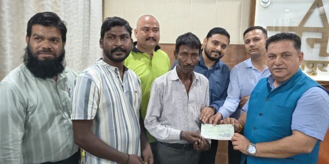 काशीपुर। कोविड महामारी के दौरान ड्यूटी निभाते हुए शहीद हुईं सफाई कर्मचारी श्रीमती उषा को श्रद्धांजलि देते हुए उनके पति श्री सुंदरलाल को मुख्यमंत्री राहत कोष से स्वीकृत 10 लाख रुपए की सहायता राशि का चेक आज काशीपुर नगर निगम कार्यालय में प्रदान किया गया।