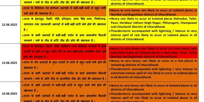 12 अगस्त को नैनीताल और बागेश्वर में भारी से बहुत भारी बारिश की संभावना है, जबकि देहरादून, टिहरी, पौड़ी, हरिद्वार, ऊधम सिंह नगर, पिथौरागढ़, चंपावत समेत कई जिलों में भारी वर्षा हो सकती है। इस दिन भी सभी जिलों में आकाशीय बिजली और तीव्र वर्षा के दौर की चेतावनी है।