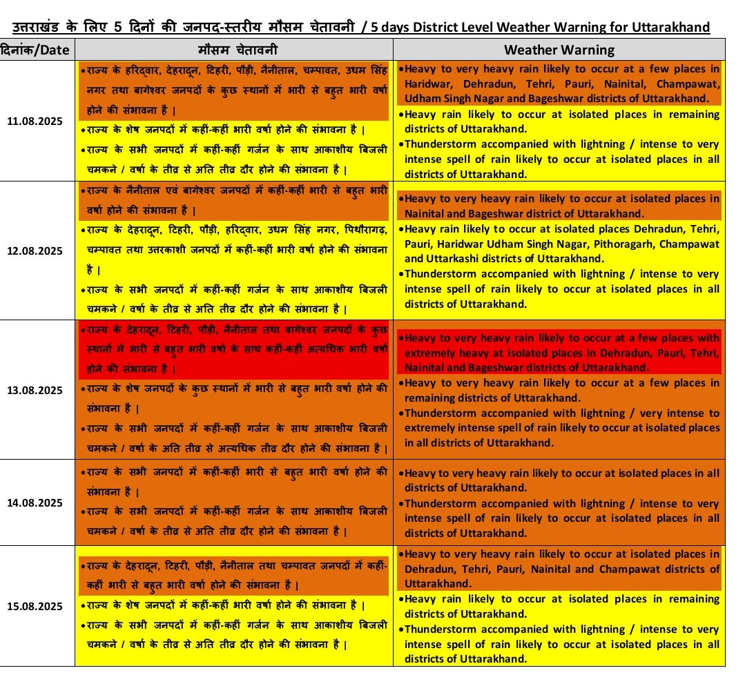 मौसम विभाग के मुताबिक, 11 अगस्त को हरिद्वार, देहरादून, टिहरी, पौड़ी, नैनीताल, चंपावत, ऊधम सिंह नगर और बागेश्वर जिलों में भारी से बहुत भारी वर्षा हो सकती है, जबकि अन्य जिलों में भी कई स्थानों पर भारी बारिश के आसार हैं। सभी जिलों में गरज के साथ बिजली गिरने और तीव्र वर्षा के दौर की भी चेतावनी दी गई है।