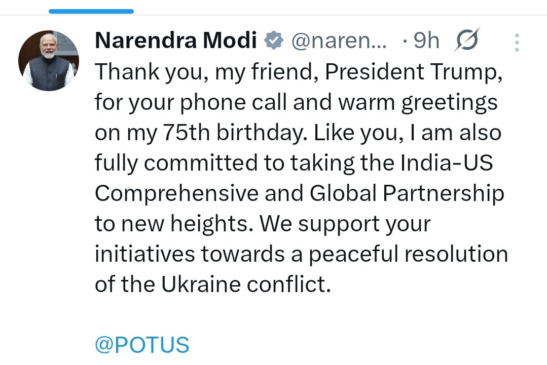 वहीं ट्रंप ने भी अपने सोशल मीडिया मंच ट्रुथ सोशल पर प्रधानमंत्री मोदी का आभार जताया। उन्होंने लिखा, “नरेंद्र: रूस और यूक्रेन के बीच युद्ध को समाप्त करने में आपके समर्थन के लिए धन्यवाद!”