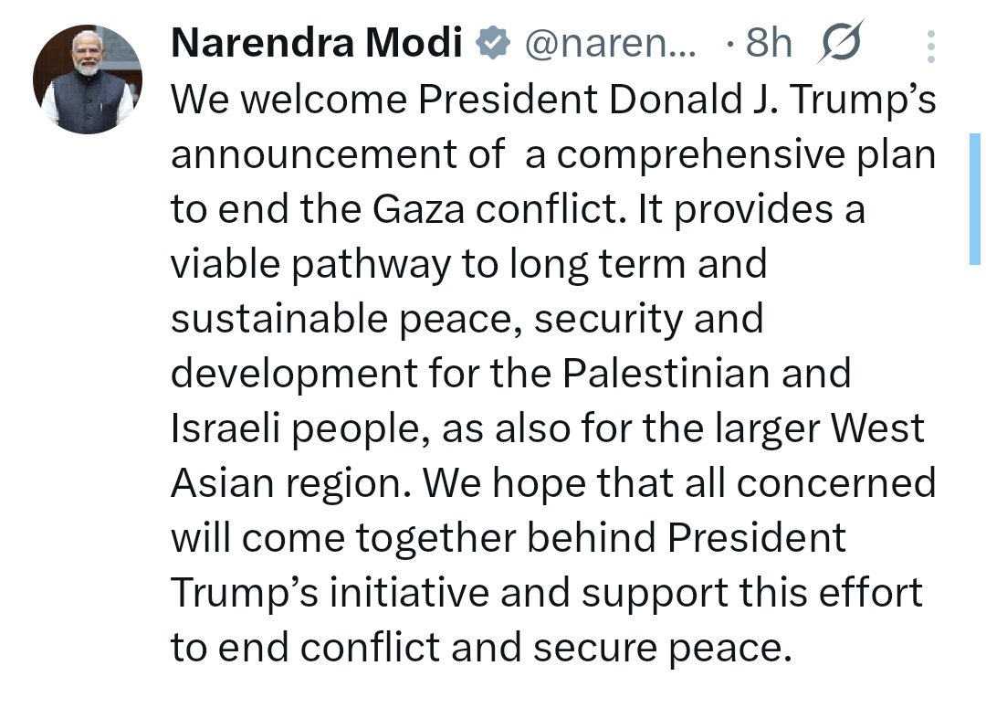 प्रधानमंत्री मोदी ने सोशल मीडिया मंच एक्स (पूर्व ट्विटर) पर पोस्ट करते हुए लिखा, “हम राष्ट्रपति ट्रंप की ओर से गाजा संघर्ष को खत्म करने के लिए एक व्यापक योजना की घोषणा का स्वागत करते हैं। यह क्षेत्र में शांति और स्थिरता की दिशा में एक अहम कदम है।”