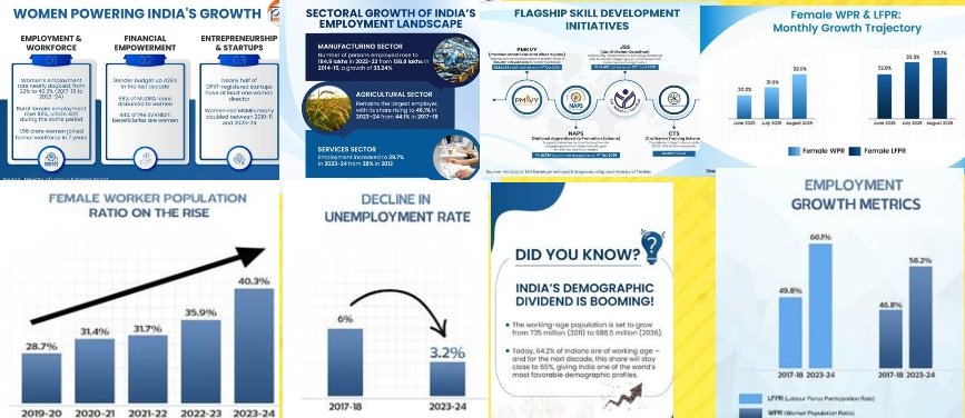 भारत के जनसांख्यिकीय लाभांश को लक्षित पहलों के माध्यम से सक्रिय रूप से विकसित किया जा रहा है, जिनका उद्देश्य शिक्षा और रोज़गार के बीच के अंतर को पाटना है। अर्थव्यवस्था में स्टार्टअप्स और ग्लोबल कैपेबिलिटी सेंटर्स (जीसीसी) जैसे उभरते क्षेत्रों में भी रोज़गार वृद्धि देखी जा रही है, जो युवाओं के लिए नए और विविध रोज़गार के अवसर पैदा कर रहे हैं। भारत का स्टार्टअप इकोसिस्टम दुनिया का तीसरा सबसे बड़ा है, जिसमें 1.9 लाख डीपीआईआई से मान्यता प्राप्त स्टार्टअप हैं, जिन्होंने 2025 तक 17 लाख से अधिक नौकरियाँ और 118 यूनिकॉर्न बनाए हैं।