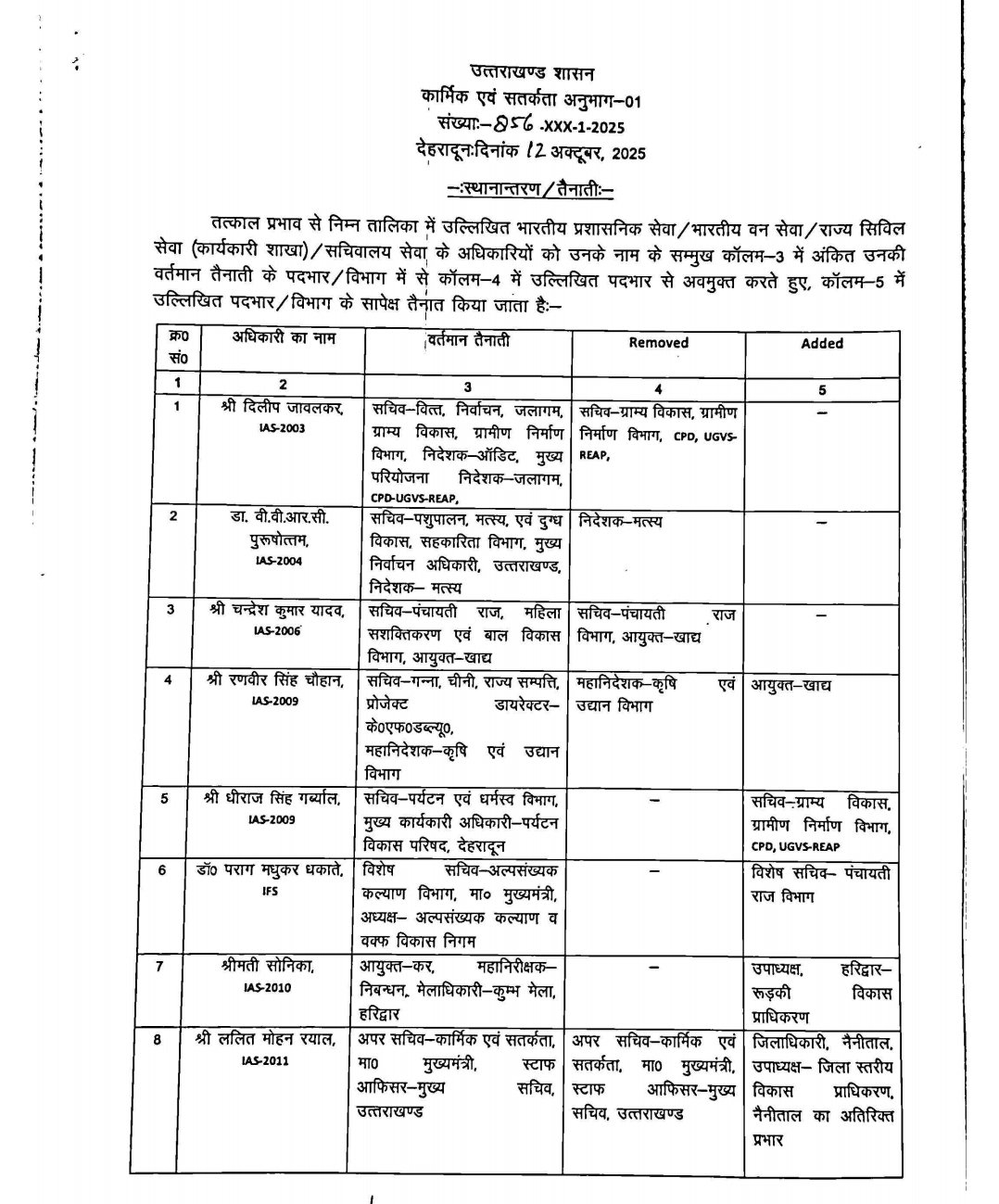 तबादला सूची के अनुसार, आईएएस दिलीप जावलकर से ग्राम विकास और ग्रामीण निर्माण विभाग की जिम्मेदारी हटा दी गई है, जबकि धीराज गर्ब्याल को इसका सचिव बनाया गया है। रणवीर सिंह चौहान को आयुक्त खाद्य की जिम्मेदारी दी गई है और पराग मधुकर (IFS) को विशेष सचिव पंचायती राज बनाया गया है।