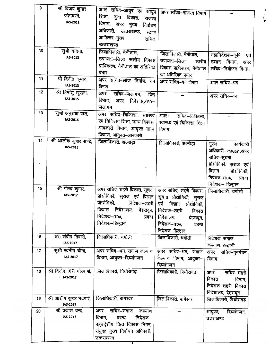 विनोद गिरि गोस्वामी को पिथौरागढ़ जिलाधिकारी पद से हटाकर अपर सचिव शहरी विकास और निदेशक शहरी विकास बनाया गया है, जबकि आशीष कुमार भटगाई अब पिथौरागढ़ के नये डीएम होंगे। अकांक्षा कोंडे को बागेश्वर का जिलाधिकारी बनाया गया है और अंशुल को अल्मोड़ा का डीएम नियुक्त किया गया है।