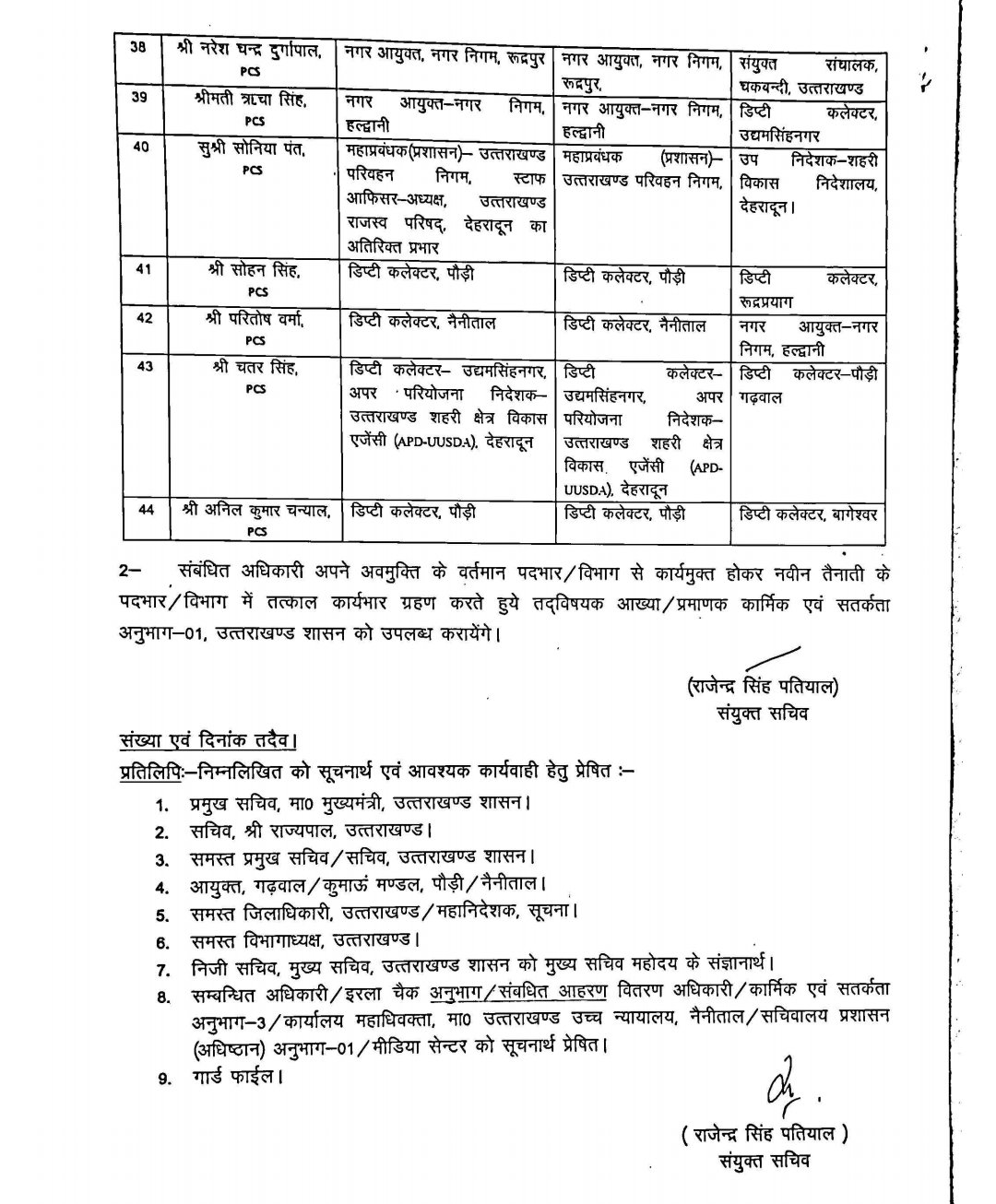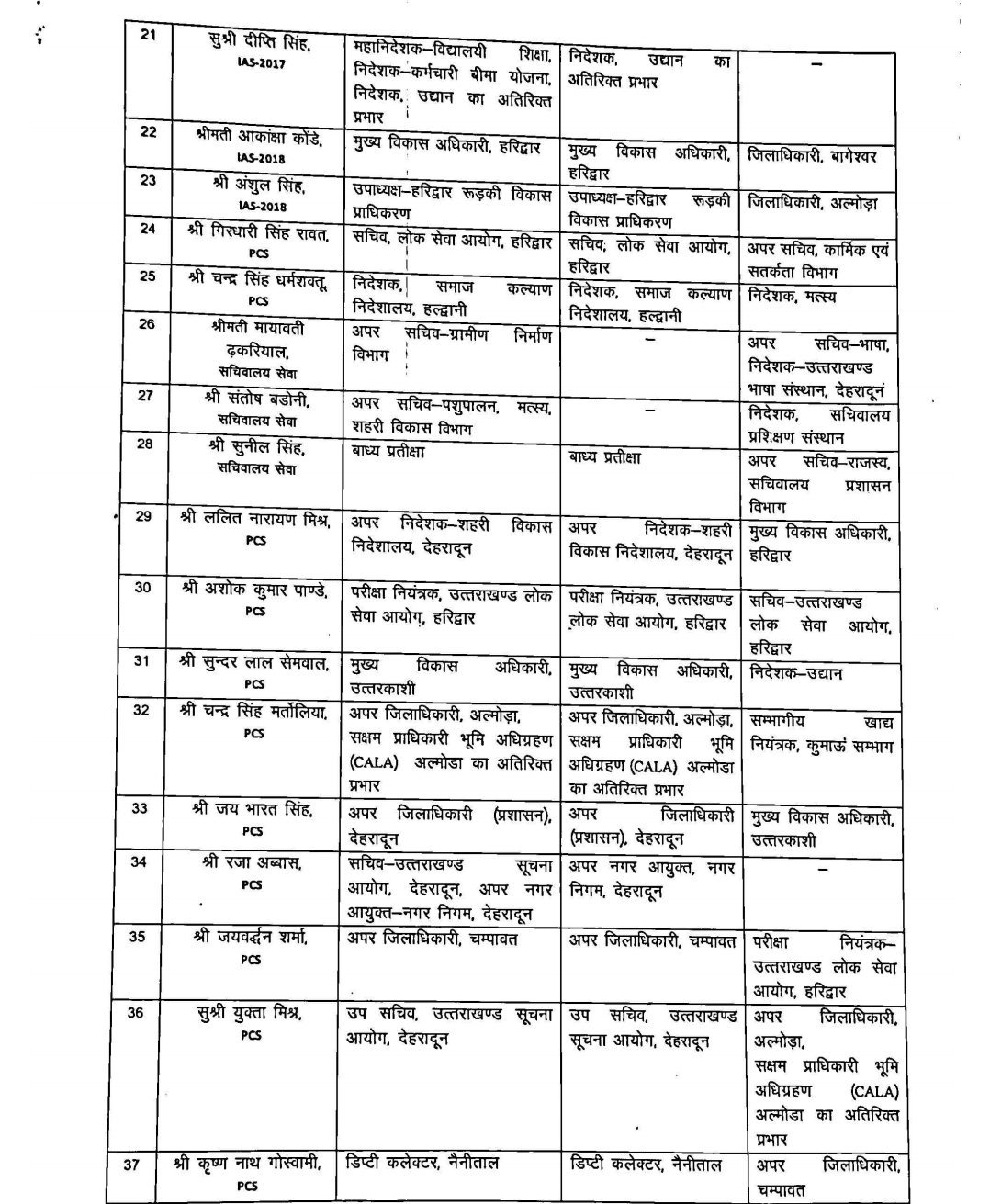 सचिवालय सेवा के तहत मायावती ढकरियाल को अपर सचिव भाषा एवं निदेशक भाषा संस्थान, संतोष बडोनी को सचिवालय प्रशिक्षण संस्थान का निदेशक, और सुनील सिंह को अपर सचिव राजस्व एवं सचिवालय प्रशासन की जिम्मेदारी दी गई है।