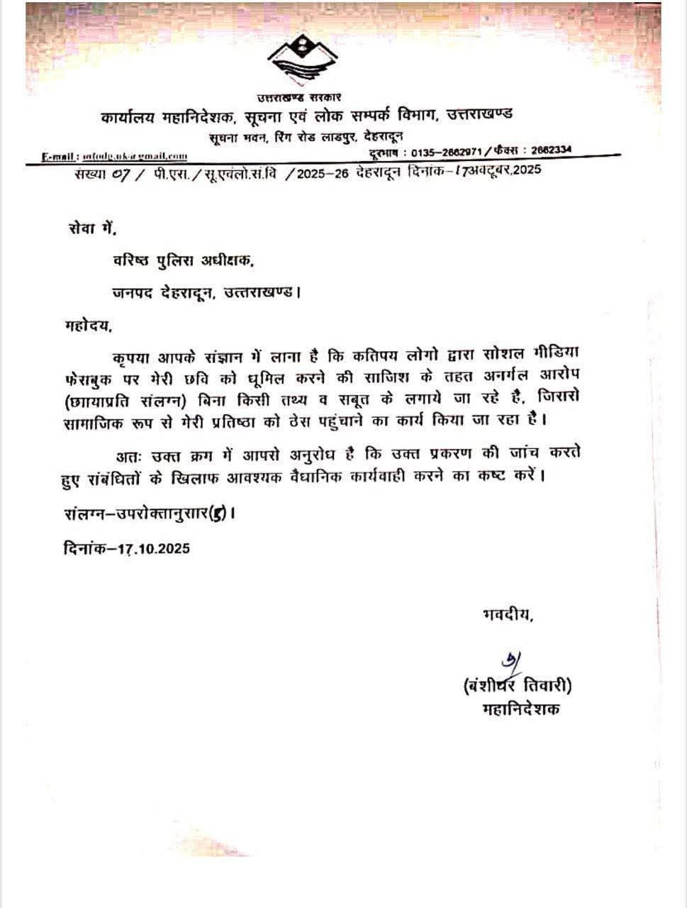 इस संबंध में सूचना महानिदेशक की ओर से वरिष्ठ पुलिस अधीक्षक देहरादून को एक औपचारिक पत्र जारी किया गया है। पत्र में कहा गया है कि तिवारी के खिलाफ निराधार आरोप लगाए जा रहे हैं, जिनका उद्देश्य उनकी व्यक्तिगत एवं सरकारी प्रतिष्ठा को ठेस पहुंचाना है।